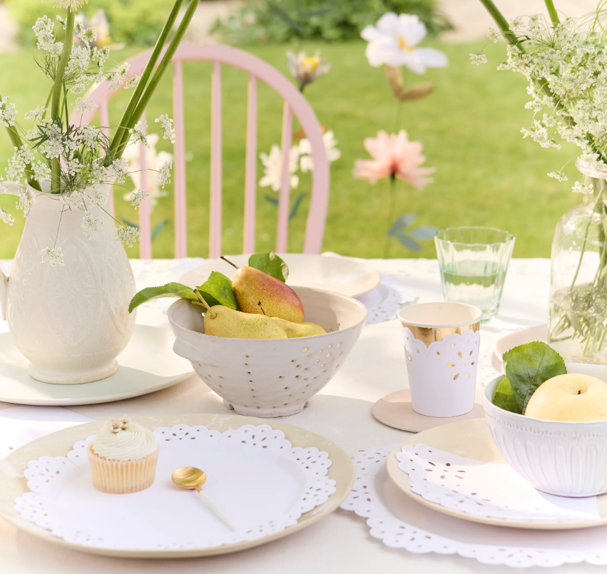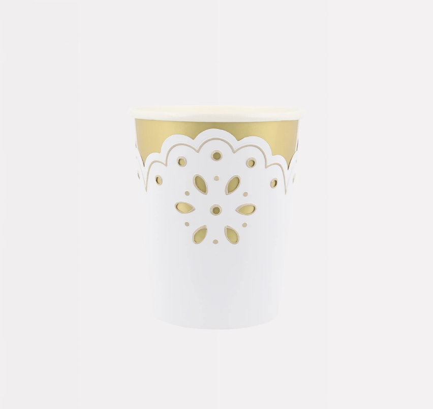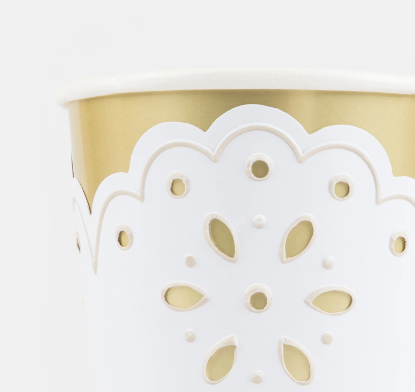 Šį gražų šventinį asortimentą įkvėpė broderie anglaise – subtilus nėrinių raštas, kuris vėl tapo madingas. Šios baltos taurės su švelniu dramblio kaulo spalvos įspaudu ir blizgančia šampano aukso spalvos folija suteiks jūsų vakarėlio gėrimams elegantišką išvaizdą.Jos puikiai tinka vestuvių pokyliams ar bet kokiai kitai šventei, kai norite elegantiškos ir rafinuotos išvaizdos.